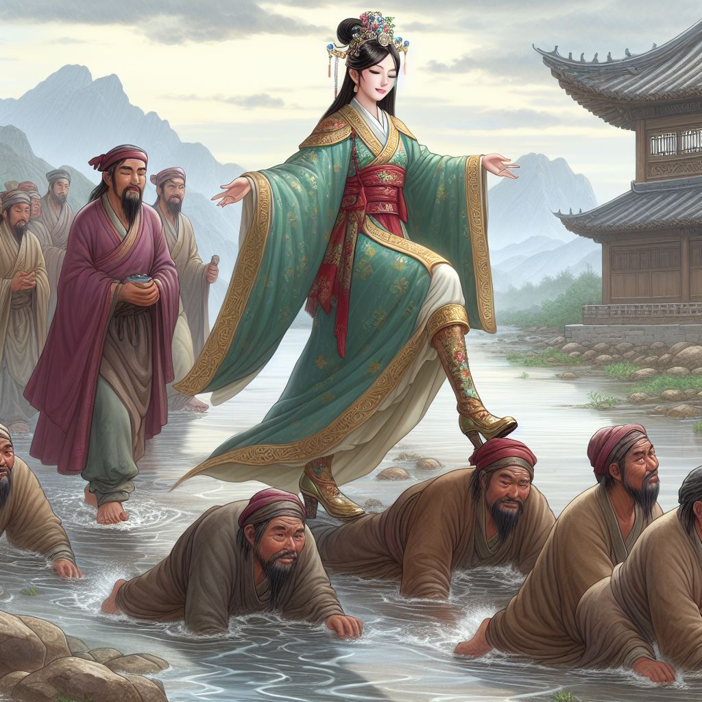 Crossing the river has never been easier when there are hundreds of thousands of willing subjects to serve as the stepping boards of their divine Princess to ensure she doesn't get her royal boots wet.