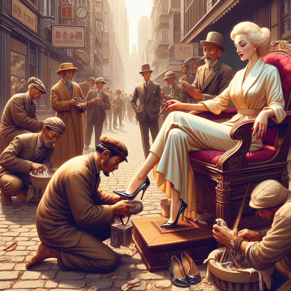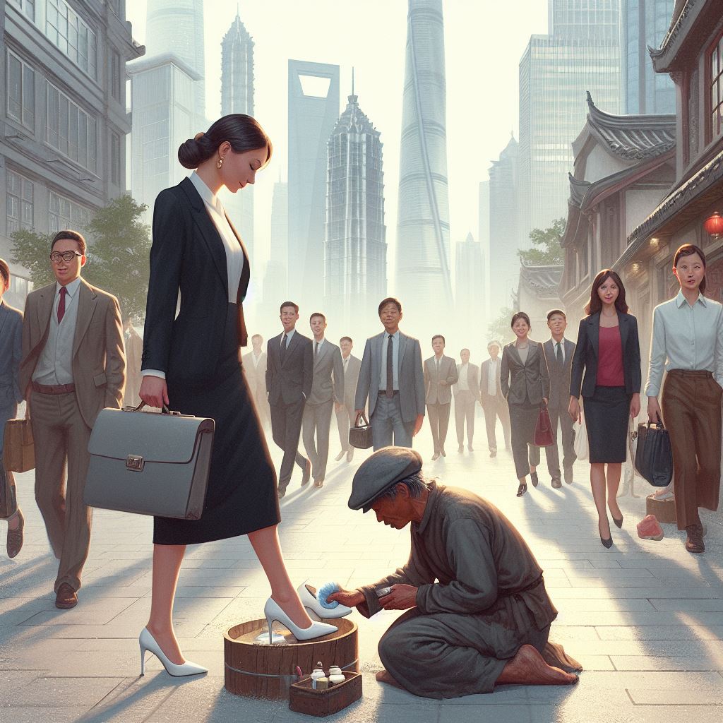 In the streets of Shanghai China, a poor beggar offers to shine the shoes of a well groomed Lady for a penny