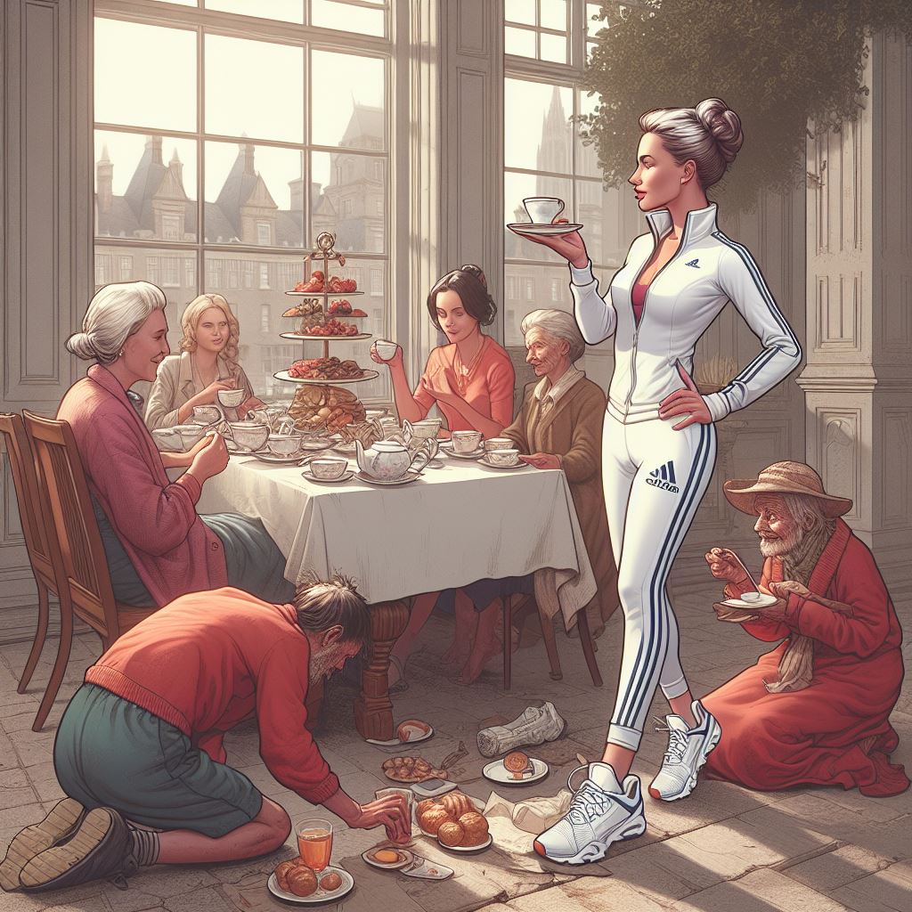 Life has been unfair all the while in this scene where a rich classy Lady sips on her high tea after her tennis session while poor beggars begged for money and scraps of food at her feet