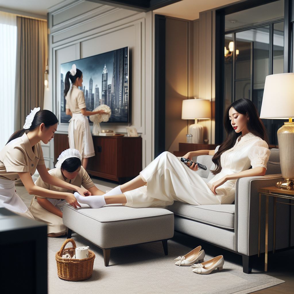 The wealthy Lady has no limits to her extravagant lifestyle when she's back to her mansion , servants at her disposal comply to any of her wishes